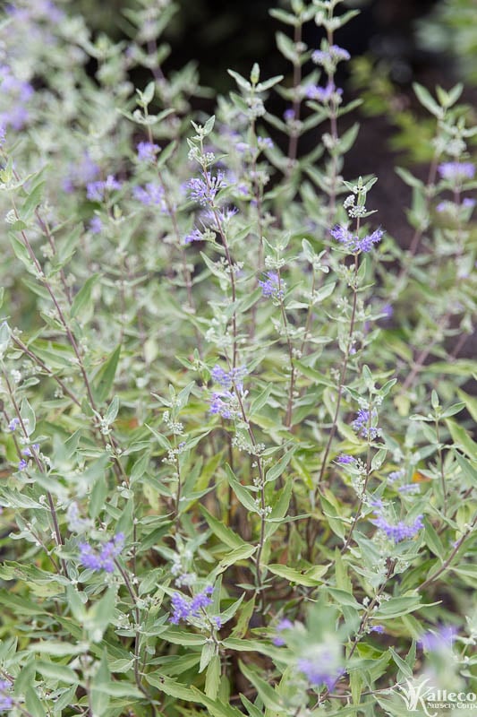 Description: Caryotperis is sometimes called “blue spirea”, an apt name. This woody shrub is small with a mounding tendency. Its long, pink-ish stems bear angular leaves. Its foliage is usually silver-green or silver-yellow.
